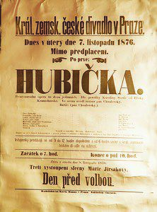Plakát informující o premiéře opery Hubička. Je s podivem, že na plakátu jsou uvedena jména Karoliny Světlé a Elišky Krásnohorské, ale jméno Bedřicha Smetany chybí.