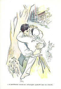 …přilítne k němu, dvě chvějící se ruce zavěsí se mu okolo krku – a políbení stokrát vřelejší než kdy pod osikou zahoří mu na rtech. Obejme Lukáš nevěstu okolo pasu, vyzdvihne ji a bez dalších slov si ji nese v náručí nazpět domů. Ilustraci v r. 1940 namalovala Ludmila Rambousková pro knihu Karolina Světlá: Hubička. Praha 1940.