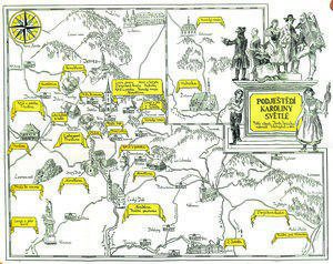 Podještědí Karoliny Světlé na kresbě z r. 1957. Josef Scheybal mapku nakreslil dle údajů Josefa Špičáka, vydavatele a životopisce Karoliny Světlé. O některých jejích dílech ukotvených v okolí naučné stezky se dočtete na dalších zastaveních.