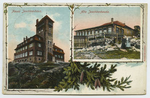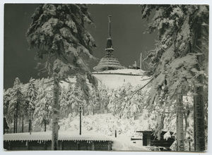 Starý Ještěd a Rohanovu chatu vystřídal v 70. letech hotel a televizní vysílač, jak ho známe dnes. Zde na dobové fotografii z dramatických let přestavby. Architekt K. Hubáček o Ještědu řekl: Koukal jsem na Ještěd a hned jsem věděl, co musím nakreslit. Věděl jsem, že musím prodloužit horu.
