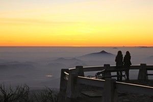 Pohled z Ještědu do celého Podještědí v době inverze. Špičatý vrch nejvýrazněji vystupující z mlhy je Ralsko.