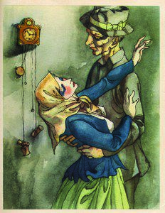 …přilítne k němu, dvě chvějící se ruce zavěsí se mu okolo krku – a políbení stokrát vřelejší než kdy pod osikou zahoří mu na rtech. Obejme Lukáš nevěstu okolo pasu, vyzdvihne ji a bez dalších slov si ji nese v náručí nazpět domů. Ilustraci v r. 1940 namalovala Ludmila Rambousková pro knihu Karolina Světlá: Hubička. Praha 1940.