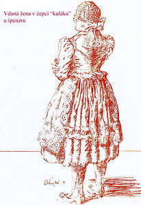 Kresba Josefa Scheybala z publikace Lidový kroj v Podještědí (1982). Kulák byl tvrdý čepec, který se do vesnické módy dostal z města kolem poloviny 19. století. Měkké čepečky pak nosily už jen ženy v šestinedělí. Špenzr byl kabátek jen do pasu s širokým výstřihem, výrazným límcem a bohatě nařasenými rukávy na ramenou.