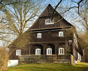 Stavení, které proslulo jako dům U sedmi javorů, se nachází nedaleko odsud. Naše naučná stezka se v těchto místech protíná se stezkou Ještědské vápence. Po ca. 100 metrech narazíte na jejich informační tabuli a dozvíte se více o architektuře tohoto domu. Karolina Světlá popisuje tento dům a jeho obyvatelky takto: Myslily matka i dcera od „Sedmi javorů“, že mají všecko právo nad ostatními se vypínati, když byla jejich usedlost největší a nejvýnosnější nejen na celém panství, nýbrž až k samé Mladé Boleslavi. Říkalo se mezi lidmi, že kdyby její majetník chtěl, mohl by si ji dáti vtěliti do knih jako statek zemanský. … Nejspíše se usadili Javorničtí v pohorském tom hvozdě kvůli houštině stromů podobného s nimi jména a nechávali vedle svého obydlí jako strážné znamení státi sedm nejsilnějších kmenů.