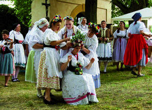 Lidový oděv nevěsty na postavě Bórinky z romaneta Černá divizna (1887): Nesla se Bórinka skutečně jako anděl v růžové damaškové šněrovačce, samá bílá krajka, s věncem květinovým ve vlasech jako zralá pšenice zlatých.