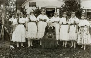 Před dívkami v krojích sedí Karolina Třešňáková, roz. Mužáková. V r. 1931, kdy byla tato fotografie u příležitosti odhalení pomníku Karoliny Světlé pořízena, jí bylo 79 let. Karolina Světlá si část svého pseudonymu vypůjčila z jejího jména. Kdyby její dcera v r. 1853 nezemřela, mohla se zúčastnit odhalení pomníku své matky stejně jako její sestřenice.